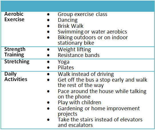 Remember! Set small goals. It’s ok to start with 5 or 10 minutes of activity a day and work your way up. You can also split your workouts. Take a 10 minute walk before each meal to get 30 minutes of activity a day. Your end goal is to exercise at least 30 minutes a day, five times a week. Hop to it!